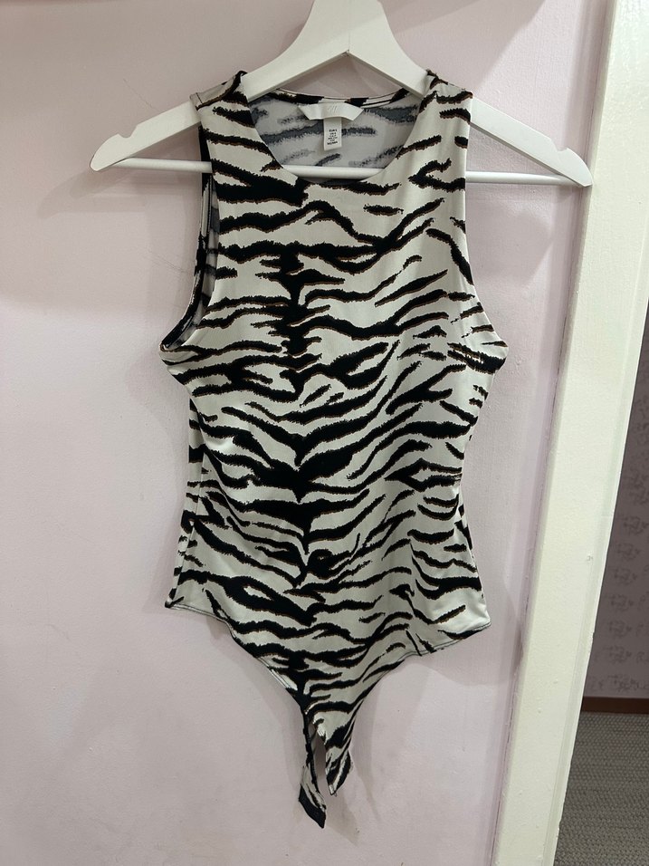 Yüksek yakalı, kolsuz ve gri zebra desenli bu bluz, normal midi boyda ve vücuda oturan kesime sahiptir.