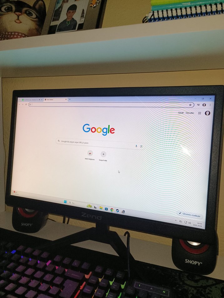 Gri renkte Zena marka monitör, Google ana sayfasını net şekilde gösteriyor. Klavye ve hoparlörlerle birlikte masa üzerinde yer alıyor. ️