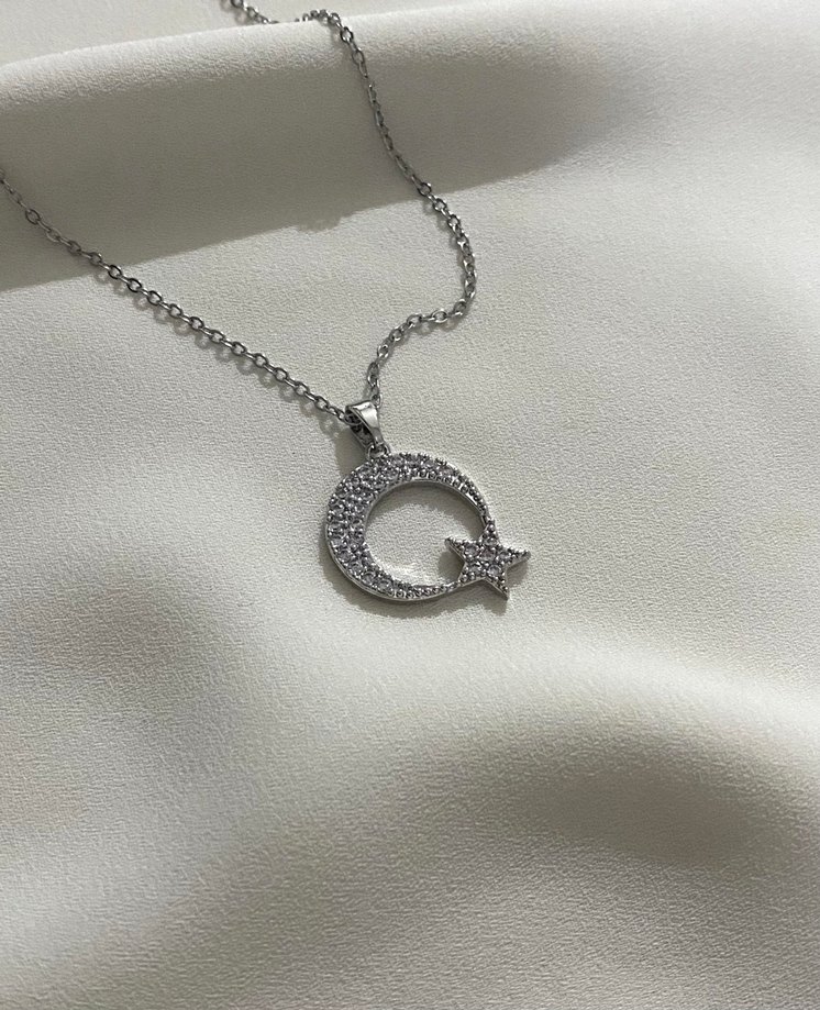 Gri renkte, zincir detaylı ay ve yıldız figürlü kolye. Normal uzunlukta ve günlük kullanıma uygun.