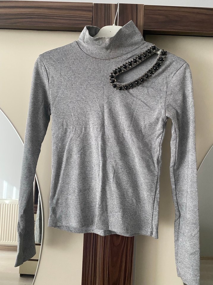 Gri renkte, balıkçı yakalı ve uzun kollu, zincir detaylı, normal midi boyda, fitted kesim kadın kazak. Günlük ve sokak stiline uygun. Taş detayının çok az bir kısmı sökülmeye başlamıştır alttan dikilebilir uygun veriyorum. Başka sorunu yok.