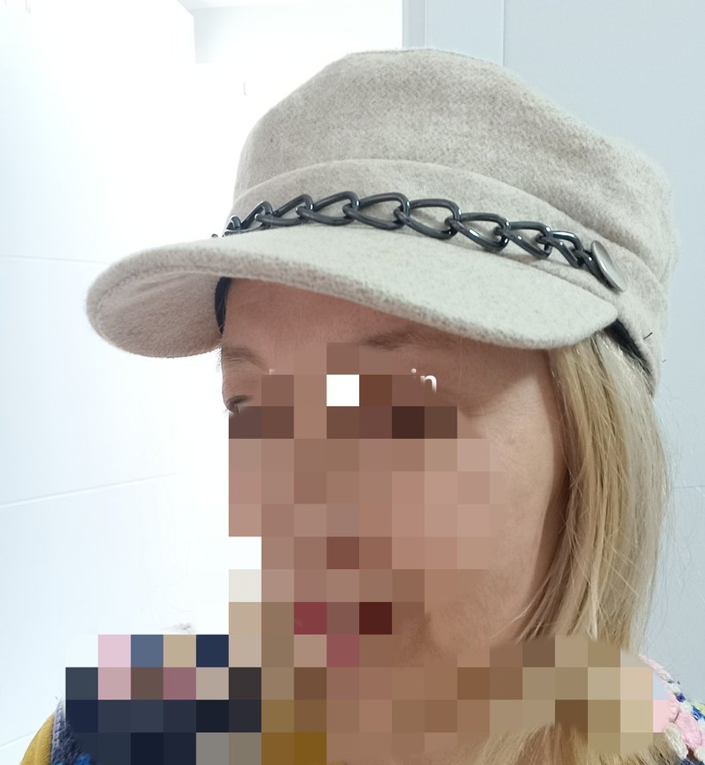 Bej yün kumaştan yapılmış, gri tonlu ve zincir detaylı kadın şapkası. Parisli karşı kültür stilini trend günlük görünümle birleştirir.