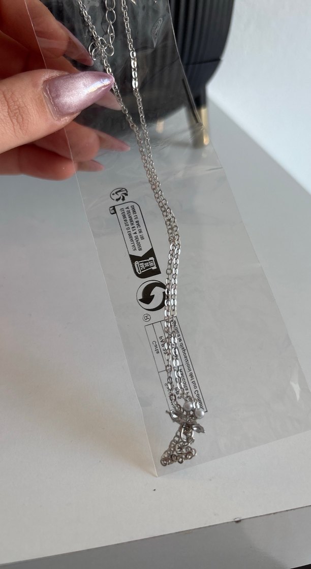 Gri zincir detayına sahip, beyaz yılan desenli kadın kolye. Normal midi uzunlukta olup, avangard ve modaya uygun tarzlar için günlük kullanılabilir.