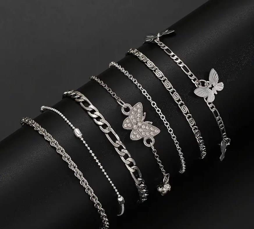Gri renkte, zincir detaylı ve kelebek figürlü minimal bohem tarzı bileklik seti, günlük kullanıma uygun. Adet fiyatıdır