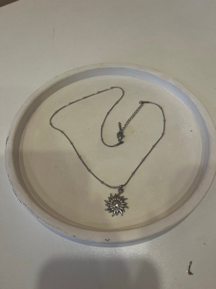 Gri renkte, zincir detaylı ve güneş figürlü kolye. Tie-dye desenli, günlük kullanıma uygun bohem tarzda.