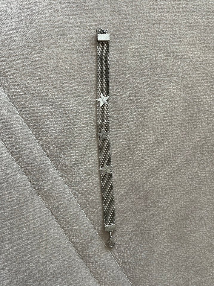 Gri zincir detaylı, yıldız süslemeli bohem tarzda kadın bileklik, günlük kullanıma uygun.