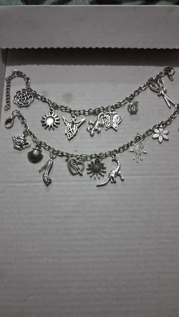 Gri renkte, zincir detaylı ve çeşitli çiçek, hayvan ve sembol figürlü charmlarla süslenmiş bohem tarzda kadın bileklik. Günlük kullanıma uygun.