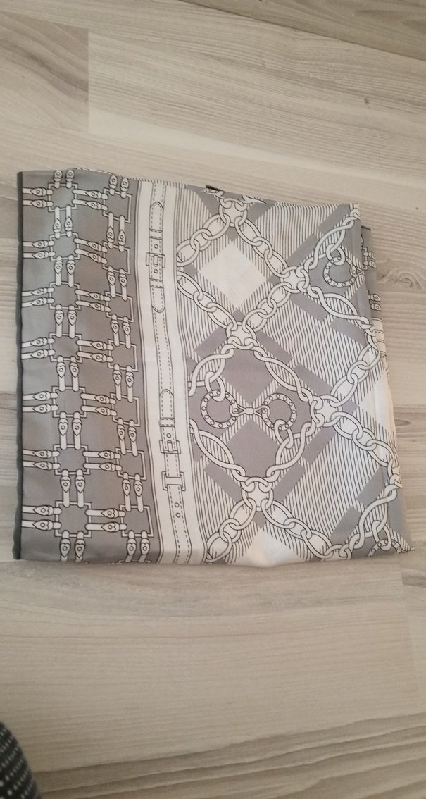 Gri zincir desenli, yumuşak sentetik kumaştan bohem ve Paris tarzını yansıtan kadın eşarp. Retro, hippie görünüm için uygun.