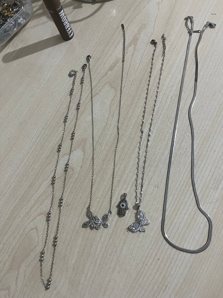 Gri renkli, zincir detaylı, kelebek ve hamsa figürlü bohem tarzda günlük kullanıma uygun kadın kolyeler.