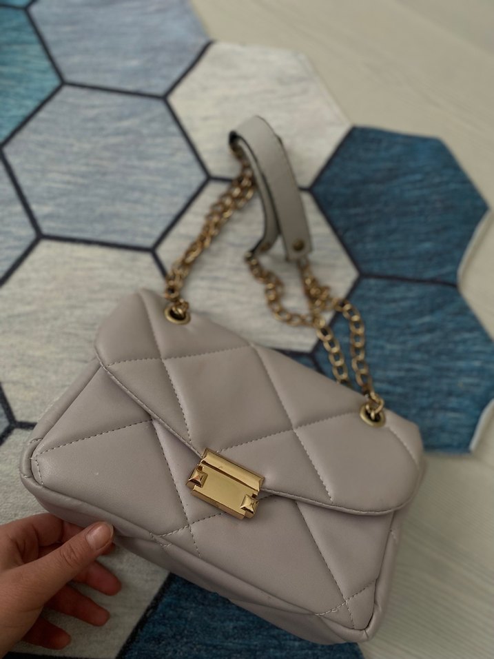 Gri deri kadın çanta, zincir detaylı ve altın renkli tokalıdır. Kapitone tasarıma sahip olup günlük kullanım için uygundur.