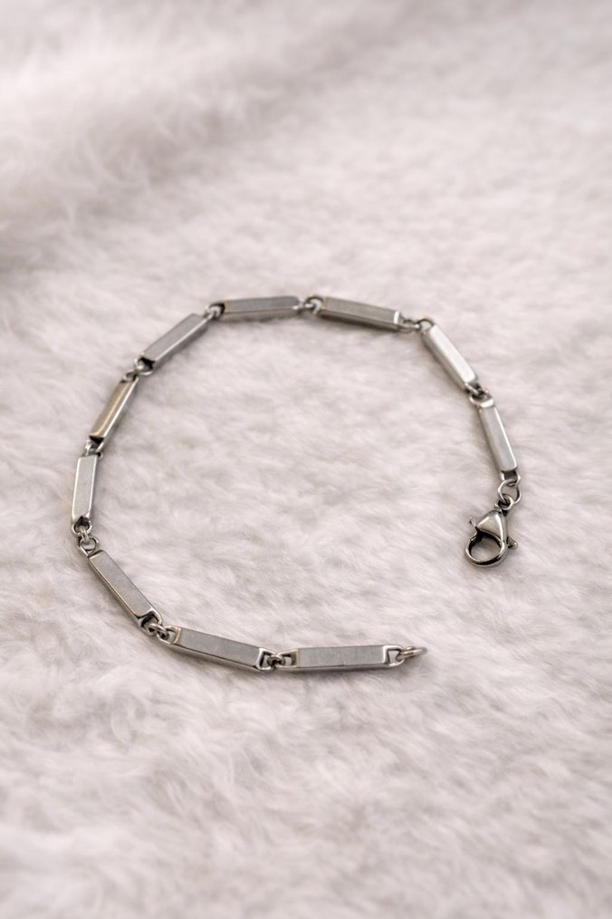 Gri renkte, dikdörtgen halkalardan oluşan zincir detaylı minimal erkek bileklik.