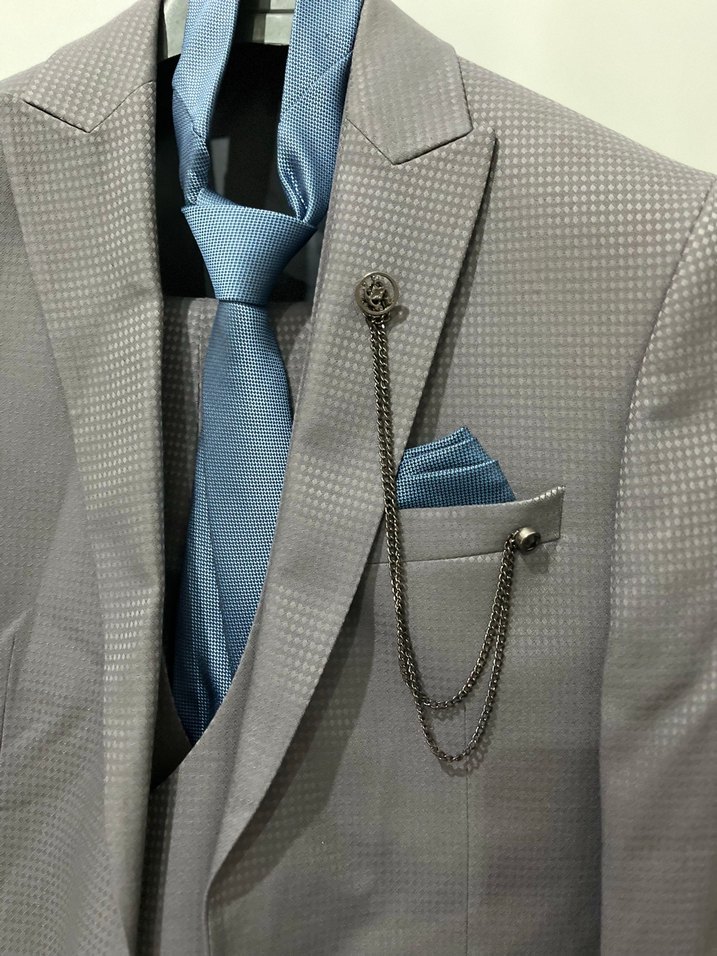 Gri renkli, zincir detaylı ve klasik kesim erkek takım elbise, modern ve şık bir görünüm sunar. ️sadece 1 kez giyildi eşimin boyu 1.70