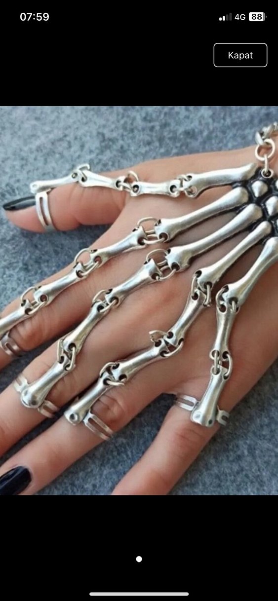 Gri renkte, zincir detaylı ve iskelet kemiklerini andıran bağlantılarla gotik tarzda kadın el zinciridir. Bohem ve retro stiller için uygundur.