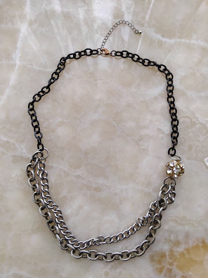 Gri renkte, zincir detaylı gotik stil midi uzunlukta kolye, küçük dekoratif bir unsur ile günlük kullanıma uygun.