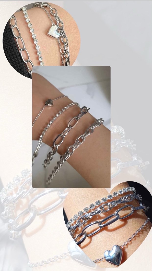 Gri renkte, zincir detaylı minimalist kadın bileklik seti, günlük kullanıma uygun şık bir aksesuar.✨