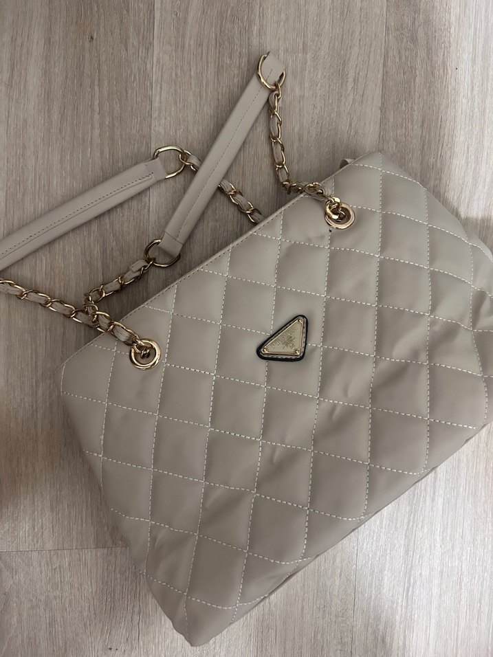 Gri renkli, zincir detaylı ve kapitone desenli sentetik kumaştan kadın çantası, günlük sokak modasına uygun. Replikadır. Hediye gelmişti hiç kullanılmadı