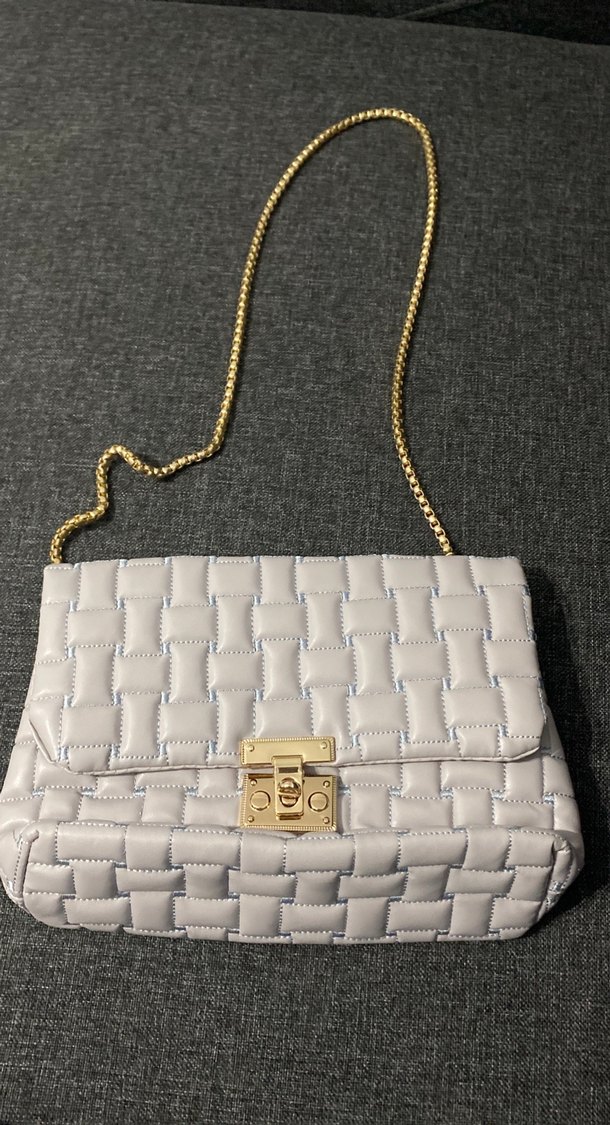 Sentetik kumaştan yapılmış, kareli desenli ve zincir detaylı gri kadın çantası. Günlük sokak stili için uygun.