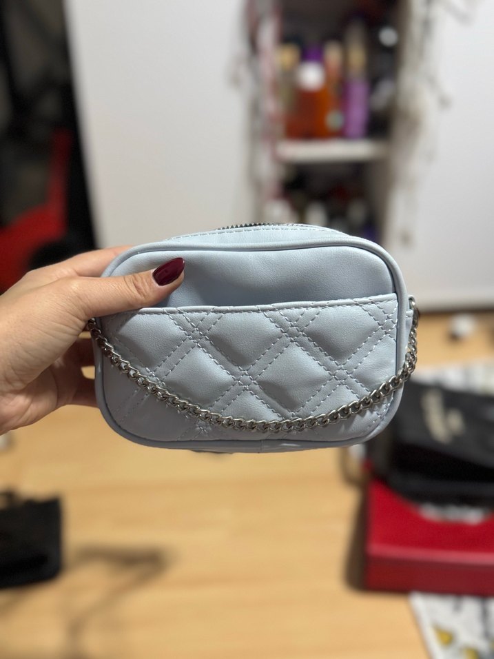 Gri deri çanta, işlemeli detaylar ve zincir askısı ile Paris sokak modasını yansıtır, günlük kullanıma uygundur. Ürün bir kaç kez kullanıldı. Fermuarında sorun vardır yaptırılması gerekmektedir