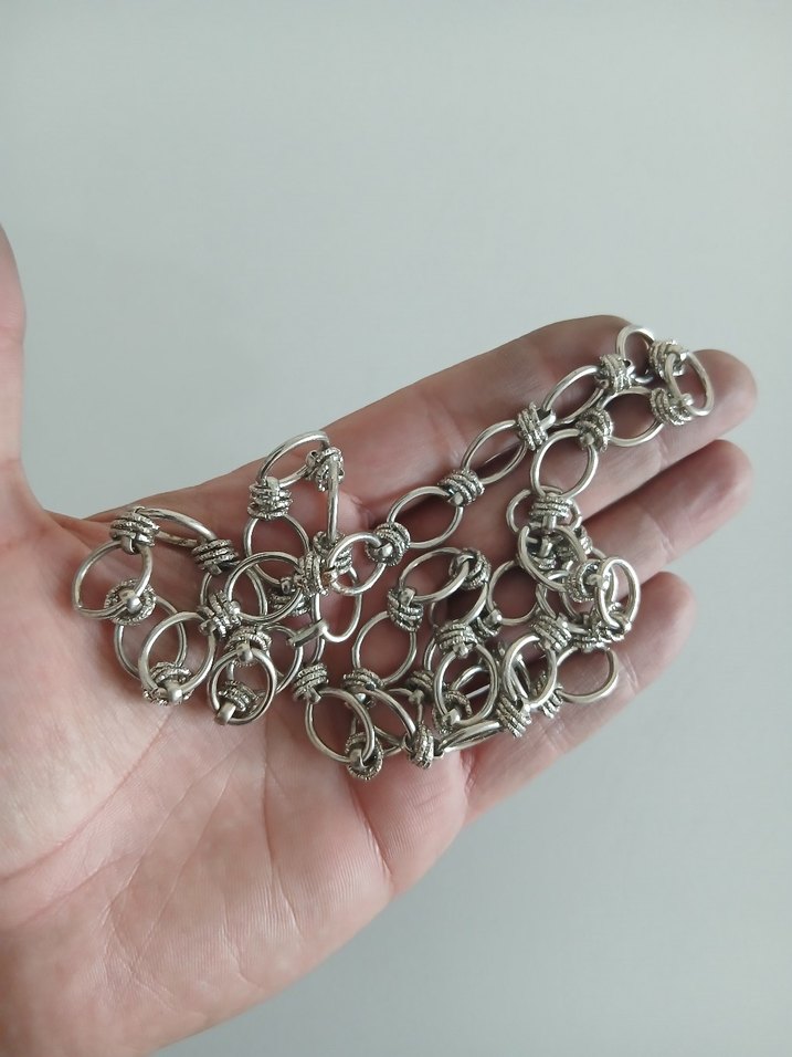Gri renkte, detaylı halka bağlantılarından oluşan kadın el zinciri. Günlük kullanım için uygun, vintage ve bohem tarzını yansıtır. ✨
