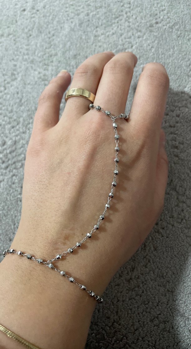 Gri renkte, zincir detaylı kadın el zinciri. Minimalist ve bohem tarzıyla günlük kullanıma uygun sade ve şık bir aksesuar. ✨
