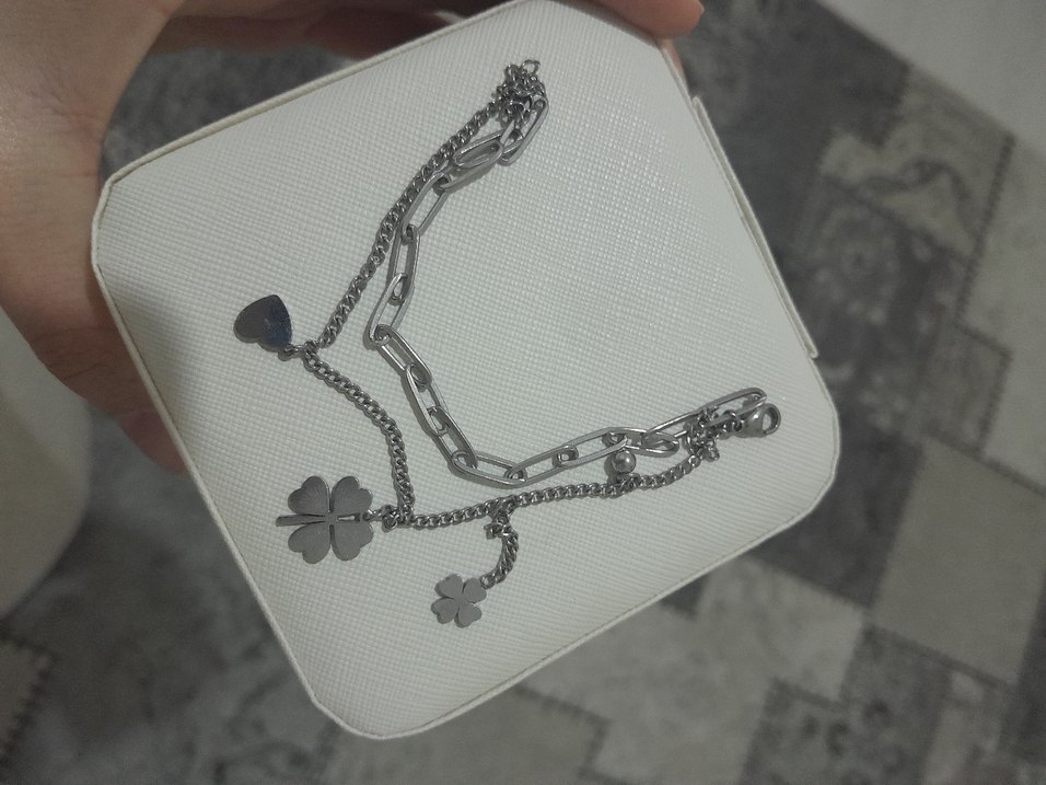 Gri renkte, zincir detaylı ve yonca figürlü kadın el zinciri, minimalist goth tarzını rock punk havasıyla yansıtıyor.