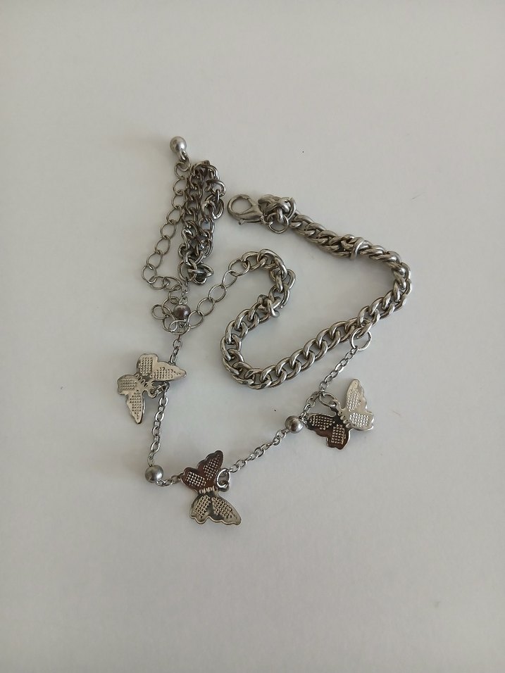 Gri zincir detaylı, kelebek figürlü kadın el zinciri. Minimalist ve bohem tarzı yansıtır, günlük kullanıma uygun.