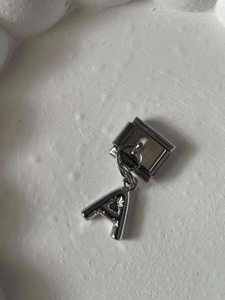Günlük kullanıma uygun, zincir detaylı ve baskılı 'A' harfi bulunan parlak gri kadın charm. Modern Paris tarzını yansıtıyor. ✨