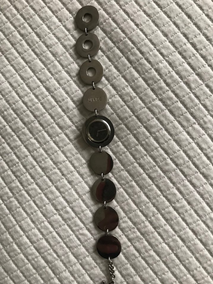 Gri zincir detaylı bilekliği ve minimalist tasarımıyla çağdaş kadın kol saati, modayı takip edenler için uygun. ⌚