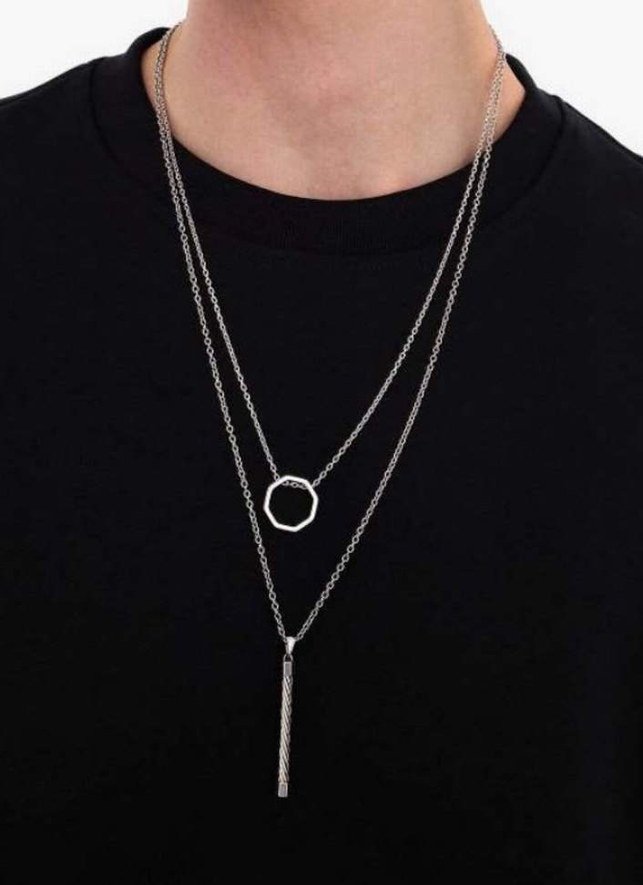 Gri renkli erkek kolye, zincir detaylı ve minimal tasarıma sahiptir. Normal uzunlukta midi katmanlıdır, günlük kullanıma uygundur. Desensiz, çağdaş ve modaya uygun bir parçadır.