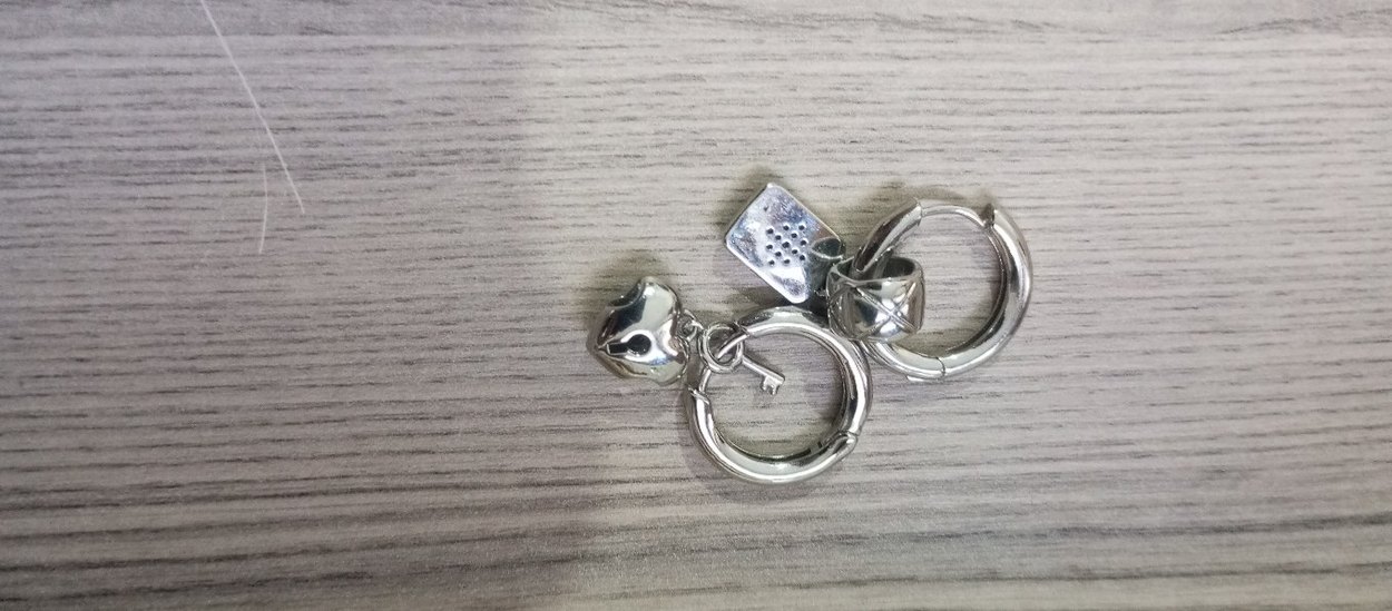 Gri renkte, zincir detaylı ve küçük süsleri olan kadın küpe Rahat ve karşı kültür tarzını yansıtan bir tasarım.