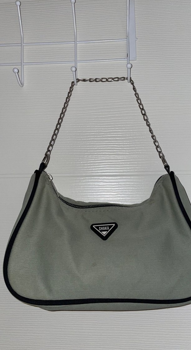 Gri renkte, zincir detaylı, sentetik kumaştan kadın omuz çantası. Minimalist tasarıma sahip, gündelik kullanıma uygun, trend sokak stili.