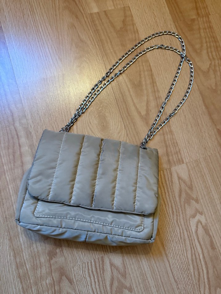 Gri renkte, zincir detaylı kadın omuz çantası. Yumuşak sentetik kumaştan, kapitone tasarımlı, günlük sokak stili için uygun.