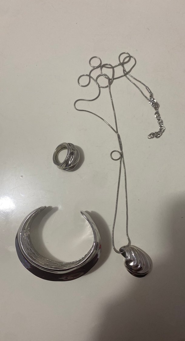 Gri renkte zincir detaylı, sade ve modern kadın takı seti. Kolye, yüzük ve bileklikten oluşur, günlük kullanıma uygundur.