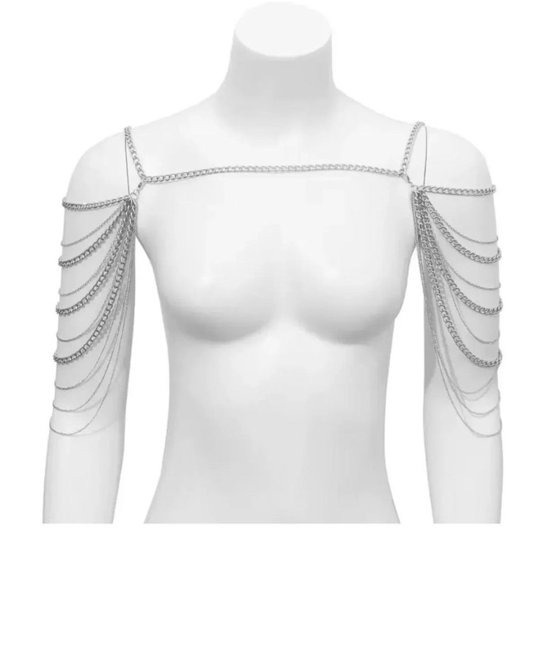 Gri renkte, omuzlarda çoklu zincir detaylarıyla avant-garde gotik tarzda günlük kullanım için uygun kadın vücut zinciri. ⚡
