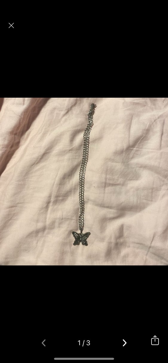 Gri renkte, detaylı zincir ve kelebek uçlu kolye, minimalist ve bohem tarzda günlük kullanıma uygundur.