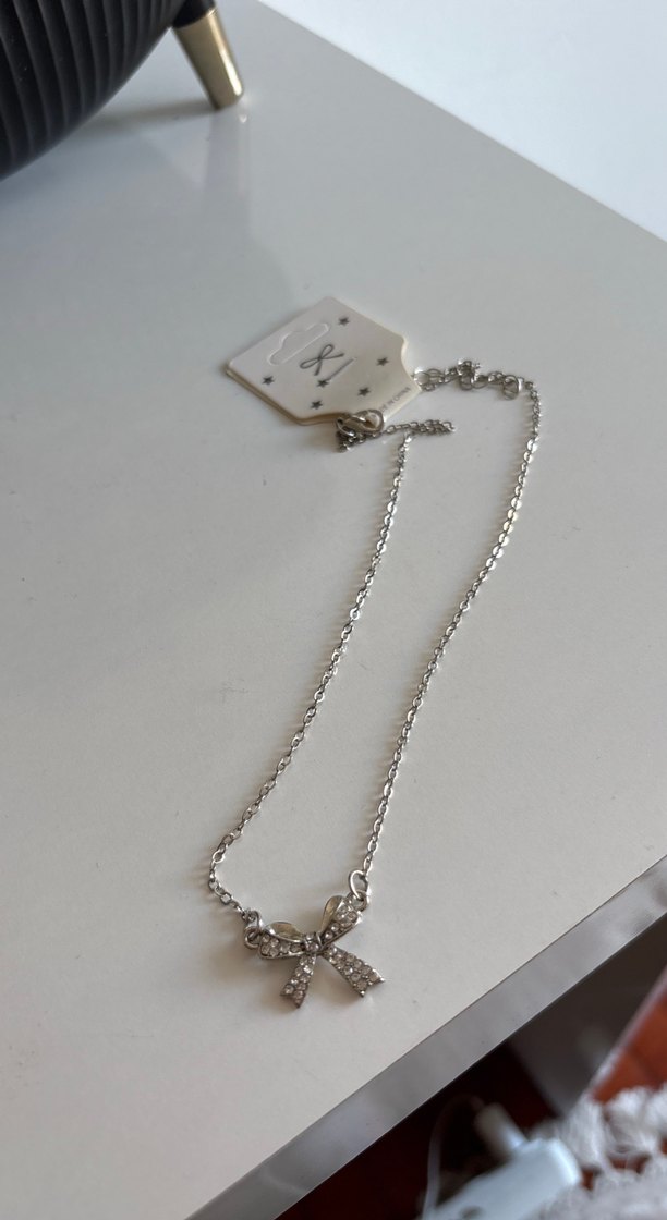 Gri renkte, zincir detaylı ve küçük fiyonk kolye ucu olan midi uzunlukta kadın kolyesi. Minimalist ve sokak stiline uygun günlük kullanım için ideal.✨