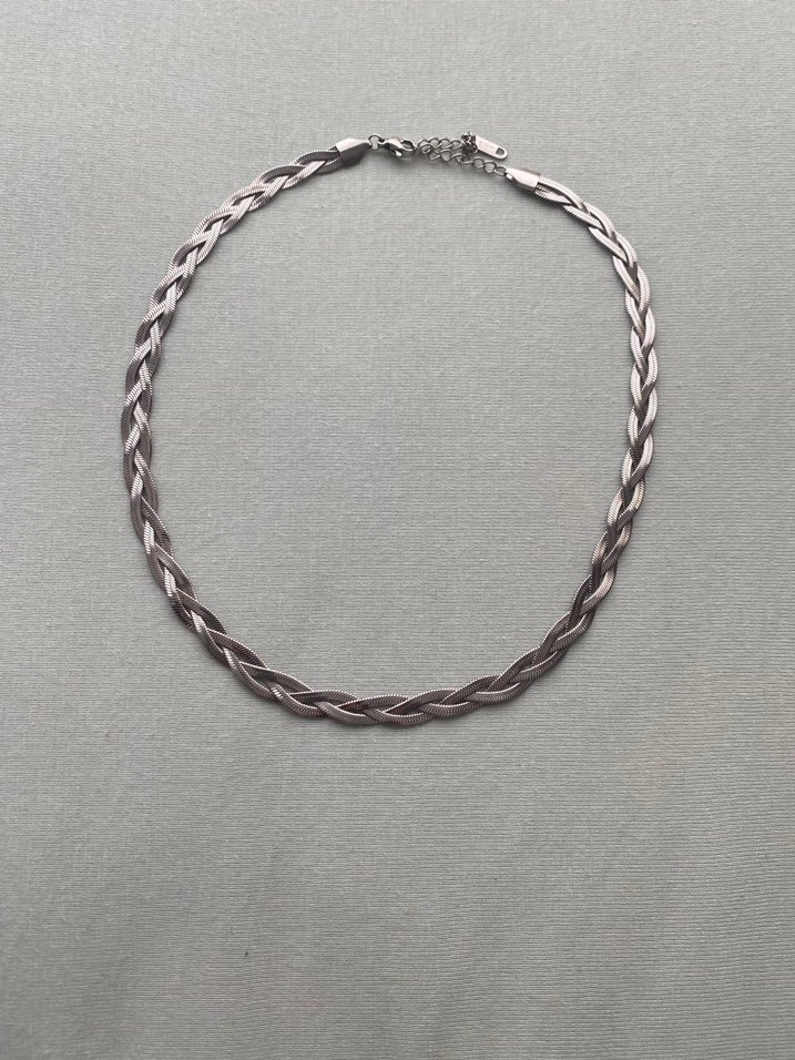 Gri-bej tonlarda, zincir detaylı ve yılan desenli, midi uzunlukta modern kadın kolyesi. Günlük kullanıma uygun bohem ve retro tarzda.