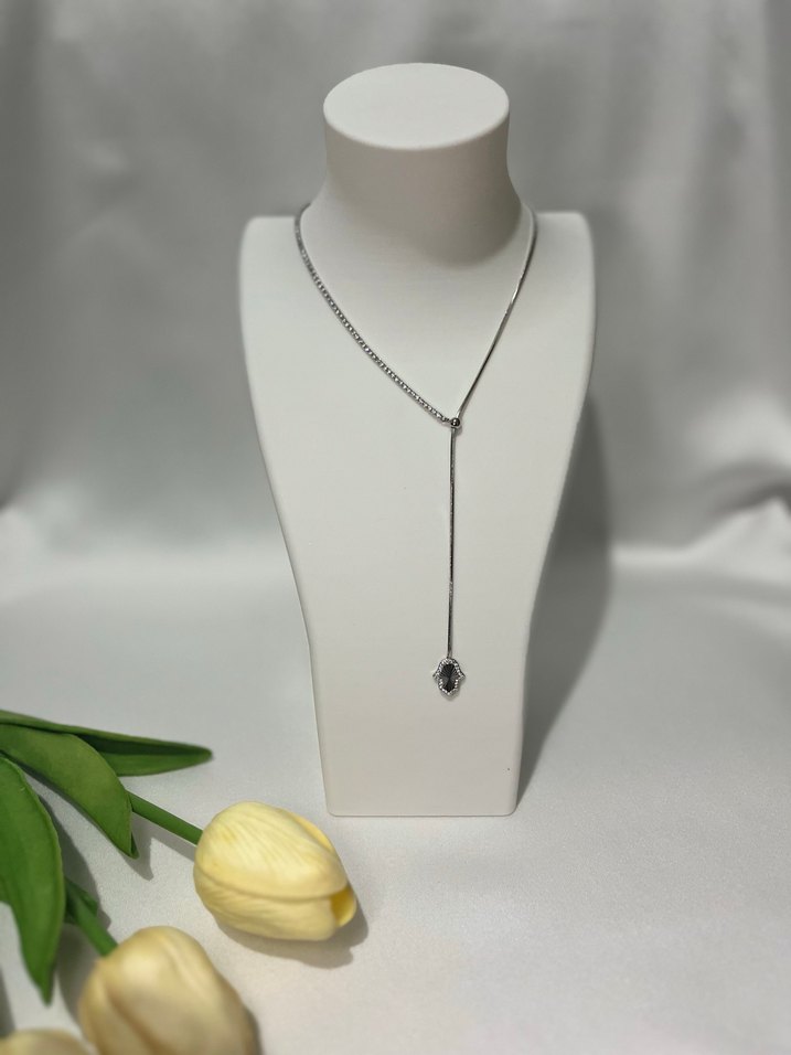 Gri renkte, zincir detaylı ve yılan desenli midi uzunlukta, modern ve minimal tasarımlı günlük kullanıma uygun kolye.