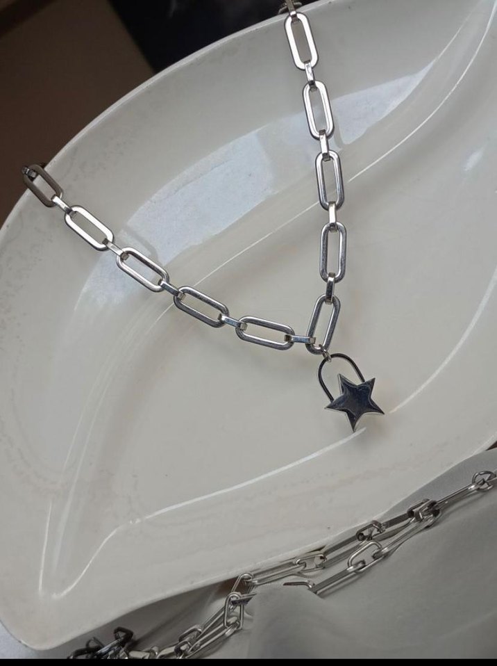 Gri renkte, zincir detaylı ve yıldız kolye ucu bulunan minimalist goth tarzda, rock punk havası veren normal uzunlukta midi kolye.