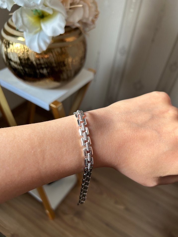 Gri ve bej tonlarında yılan deseniyle zincir detaylı, minimalist sokak stiline uygun günlük kadın bilekliği.