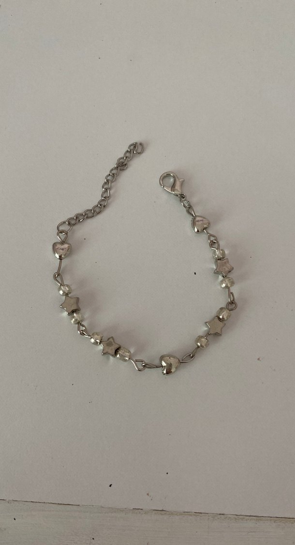Gri zincir ve yıldız ile kalp detaylarına sahip minimalist kadın bilekliği, günlük kullanım için uygundur. Desensiz ve sade tasarıma sahiptir. ✨