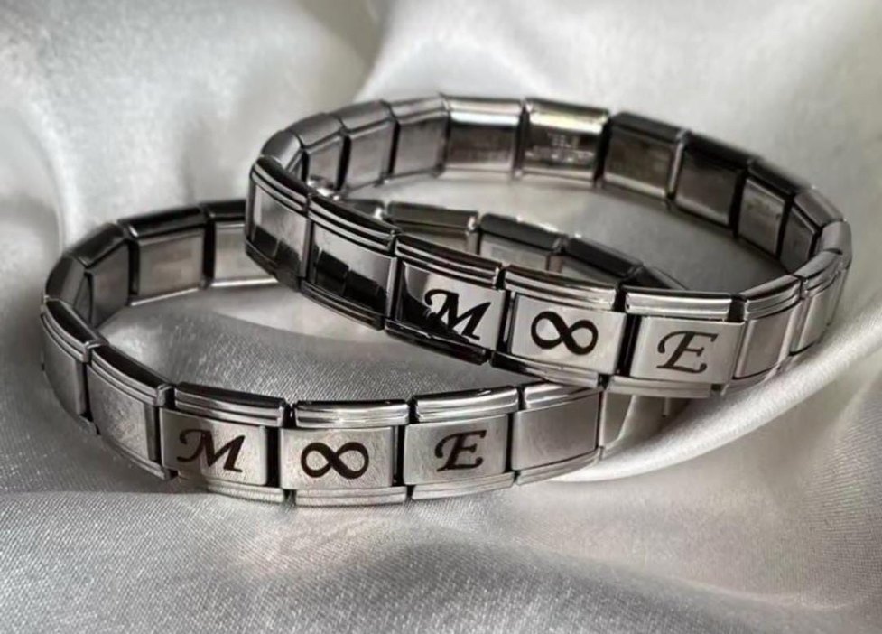 Gri renkte, zincir detaylı ve yılan desenli kadın bileklik. Üzerinde E, 8 gibi işaretler bulunur ve günlük kullanıma uygundur. Fiyat bilgisi için dm