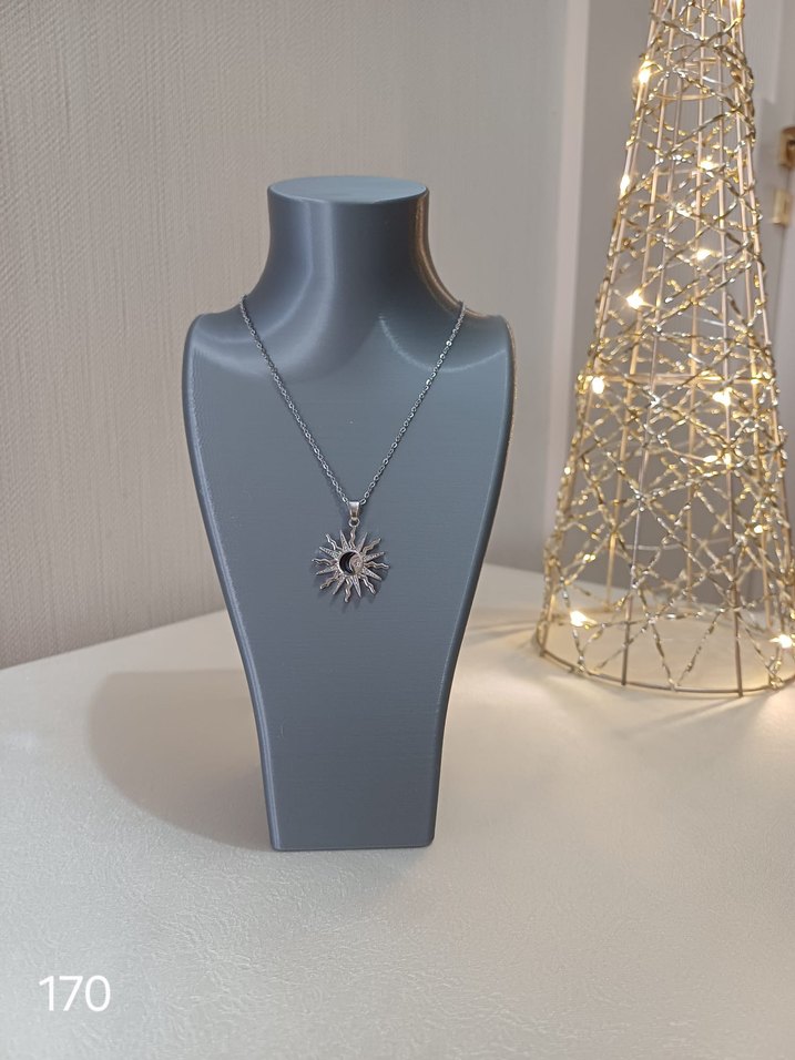 Gri renkte, zincir detaylı ve güneş figürlü kolye. Minimalist ve çağdaş tasarıma sahip, günlük kullanıma uygun midi uzunlukta bir aksesuar. ☀️
