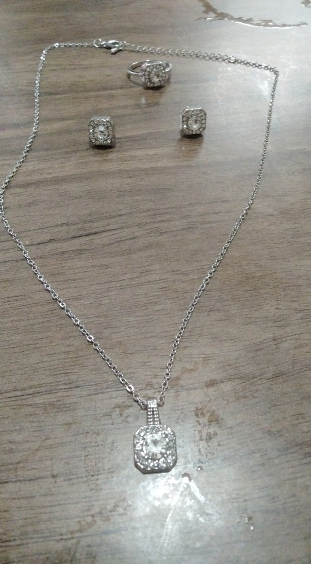 Gri renkte, zincir detaylı kolye ve kare şeklinde taşlı küpelerden oluşan minimalist kadın takı seti. Günlük kullanıma uygundur.