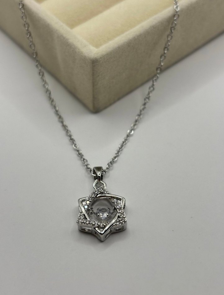 Kadın kolye, zincir detaylı ve beyaz-gri nakışlı yıldız şeklinde bir kolye ucu ile normal midi uzunluğundadır. Düğün ve modern klasik tarzlar için uygundur. Çelik olup kararma yapmaz