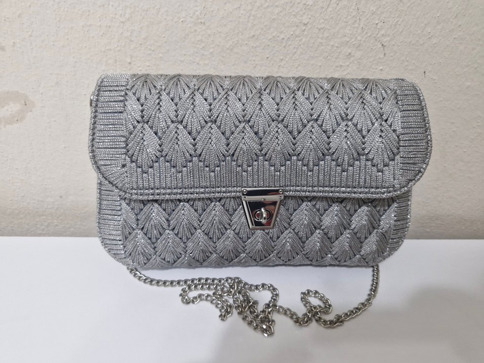 Gri renkli, işlemeli örgü kumaştan yapılmış, zincir detaylı kadın çantasıdır. Modern klasik tarzı ve günlük kullanıma uygundur. sipariş alınır