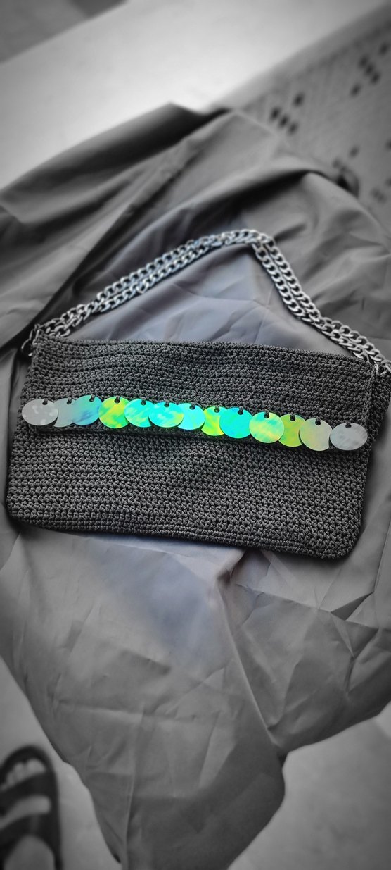Gri renkli, zincir askılı ve parlak disk detaylı örgü kadın çantası, avant-garde tarzıyla günlük kullanıma uygundur. astarli kapak pullu füme aski füme çıt cit