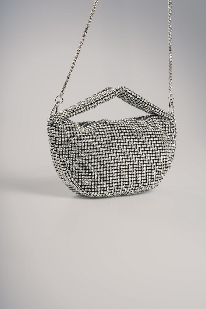 Gri renkte, zincir askılı ve puantiyeli desene sahip sentetik kumaştan kadın çantası. Günlük kullanıma uygun, çağdaş ve gösterişli tarzda.