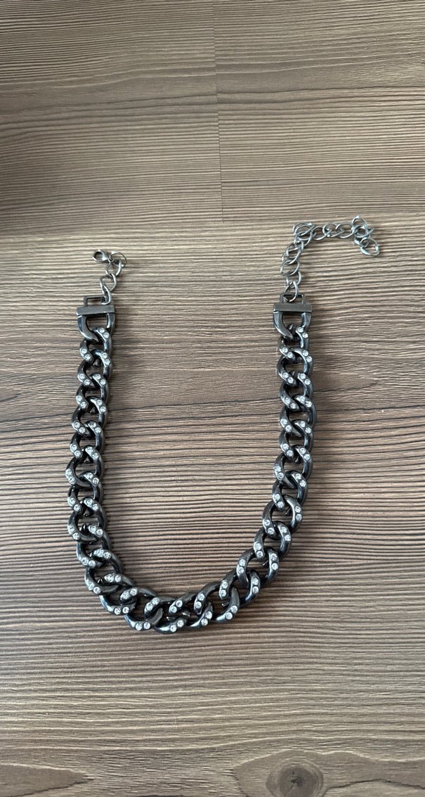 Gri renkli, yılan desenli zincir detaylı punk tarzı kadın kolye. Orta uzunlukta, grunge punk havası ile günlük kullanıma uygun.