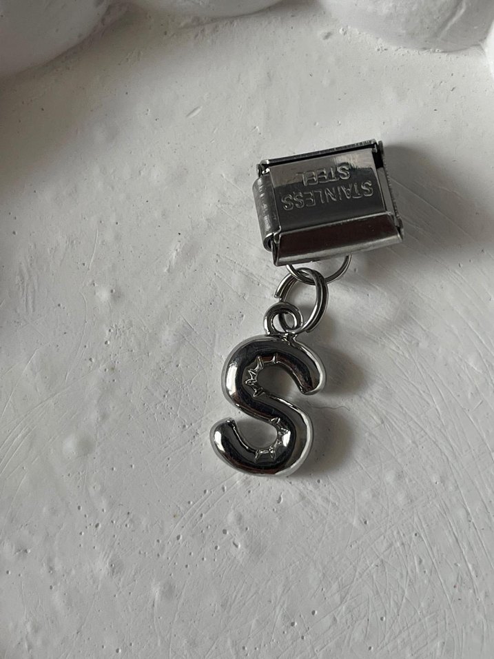 Zincir detaylı, parlak gri renkte 'S' harfi kadın charm. Minimalist ve rock punk tarzını yansıtır, günlük kullanıma uygundur. ⚡