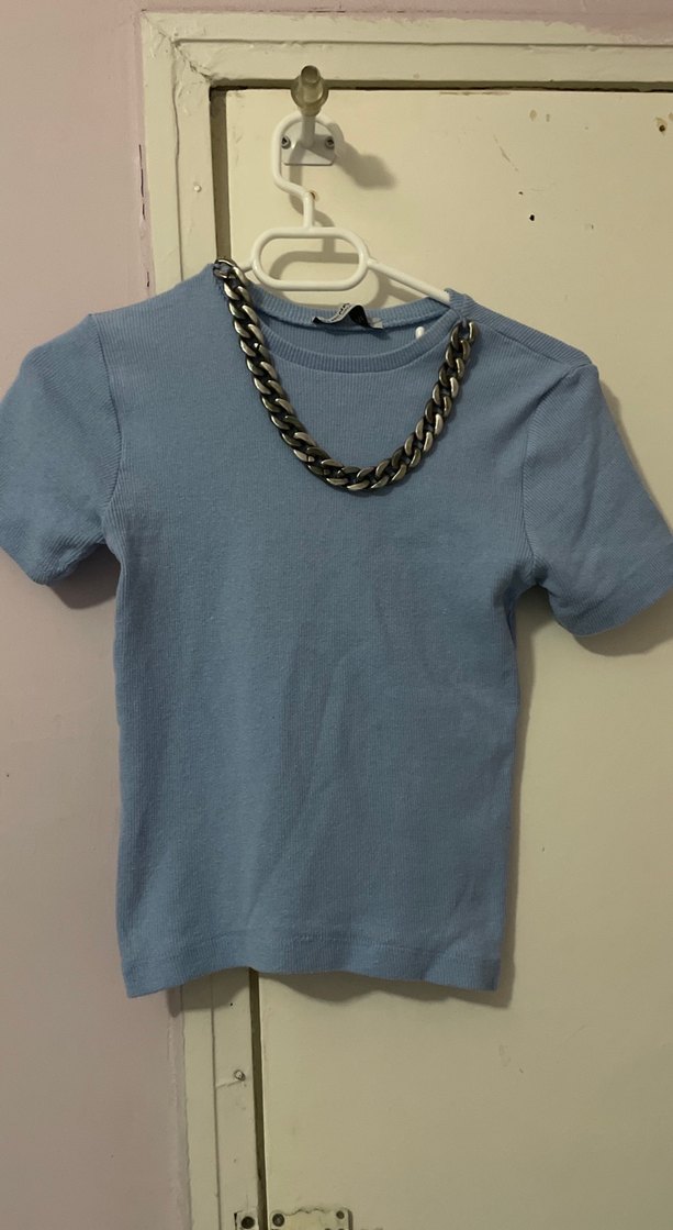 Mavi denim kumaştan, kısa kollu ve yakalı bu erkek tişörtü, gri zincir detayıyla trend sokak stili sunar.